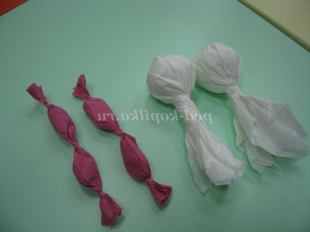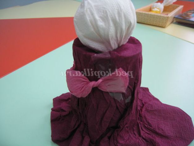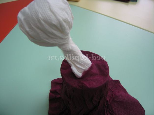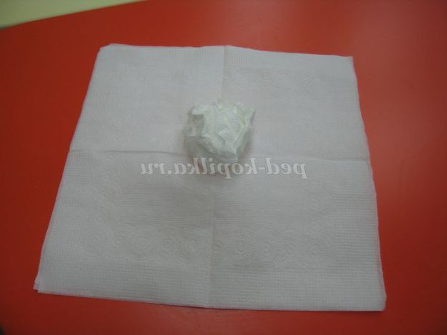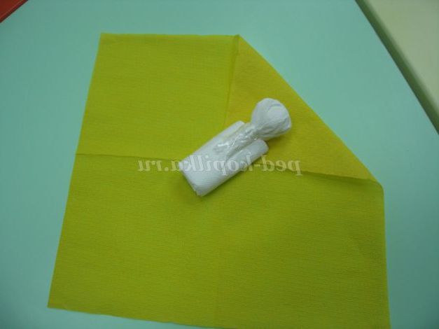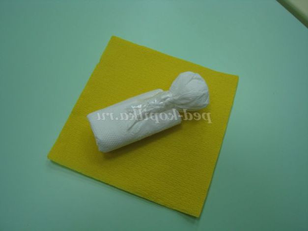 Зімніть в кульку три звичайні білі серветки і загорніть його в дві розгорнуті серветки. З'єднайте і скрутіть куточки квадрата. Закріпіть скотчем.