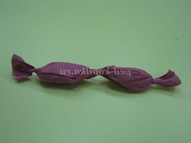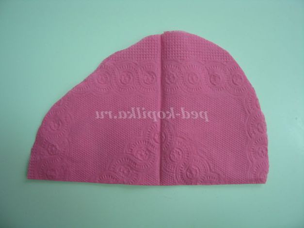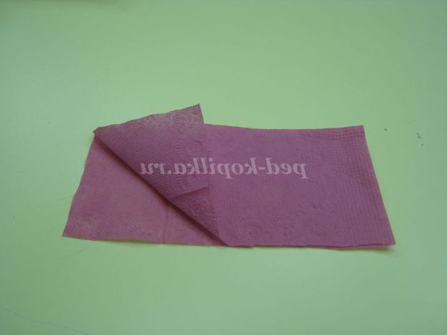 Виріжте з складеної навпіл серветки прямокутник 8х16 див. Зімніть два невеликі грудочки з серветок і покладіть їх на прямокутник. Поверніть рулон і перекрутіть його по краях і посередині.