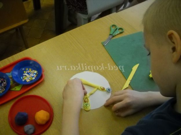 Вихователь: А тепер, хлопці, я пропоную вам, з допомогою різнокольорових джгутиків спробувати створити свої незвичайні букви. Ми будемо прикріплювати їх на круглі диски, які лежать у вас на столах.
