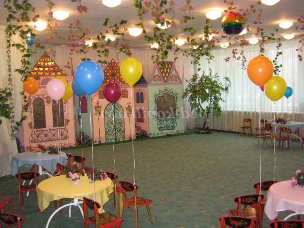 Оформлення зали: на задньому плані макети казкових будинків, розставлені столики діти сідають попереду, мами за своїми дітьми. У дітей на стільчики прив'язані повітряні кульки з гелевим наповнювачем. На столах-вази з квітами і букетики для дітей