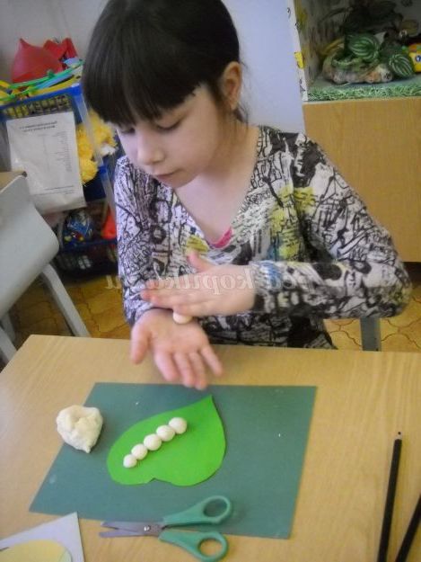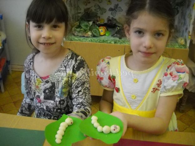 Вихователь: Молодці. Я теж думаю, що гусеницю потрібно зробити з кульок різного діаметру, тоді вона вийде симпатичніше. Не забудьте, що кожен раз вам потрібно буде брати тіста трохи менше. А перед тим як ви будете ліпити, вам потрібно вирізати листочок з картону, щоб було куди поміщати саму гусеницю.