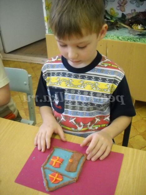 Вихователь: Спочатку вам потрібно буде розкачати тісто качалкою і вирізати стеком шаблон по контуру, який лежить у вас на столі. Потім, коли ваш будиночок буде готовий, я пропоную вам прикрасити його так, кому як заманеться, кольору можна брати будь-які, тільки пам'ятайте які кольори поєднуються один з одним.