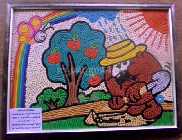 Ми з моїм 5-річним сином були просто зачаровані роботами дітей в техніці пластилинография. Місяць тому у нас в районі було оголошено конкурс серед дітей і молоді, однією з номінації якого було "Декоративно-прикладна творчість". Поміркувавши - чим би здивувати і журі, і інших конкурсантів, ми зважилися на створення "шедевра" з пластилина.Нашли рамку формату А3, роздрукували картинку улюбленого персонажа, запаслися пластиліном і робота закипела.Работали хвилин за 30-40 кожен день з перервами, так як на більший час посидючості не хватало.Под скло поклали шаблон і почали чорними пластиліновими "ковбасками" вылепливать всі контуры.Далее заповнювали малюнок кольоровим пластиліном : деякі деталі заповнювали кульками, деякі "ковбасками". В процесі ми змінили трохи картинку, так як досить складно зробити з пластиліну радіо, надто дрібно ,але додали веселку, дощову хмаринку і сонечко. Коли вся картинка була виліплена , акуратно перевернули її склом вгору і вставили у рамку. Ось наш "Копатич" і готовий. З першого погляду здається, що 5-річна дитина не зміг би зробити цю роботу, але я вас запевняю, який малюк може виліпити щось подобное.Главное підказувати йому ,як і де прилепливать детальки. Ось шаблон, взятий за первісну основу.