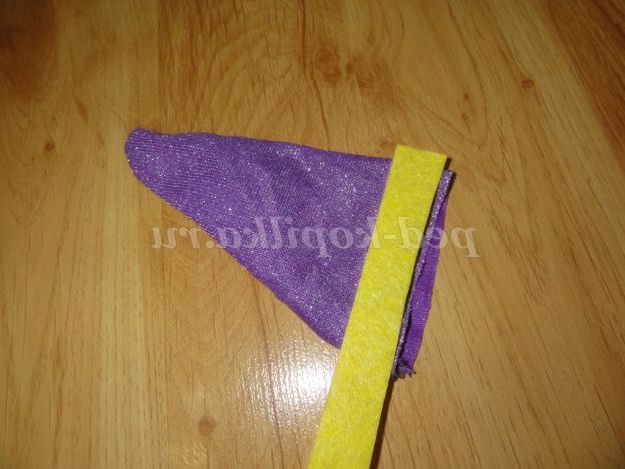 6. Крім з тканини шапочку за розміром голови (з прямокутника 20 на 15 см), зшиваємо її і прикрашаємо по краю контрастної тканиною і на край шапочки кріпимо бубон