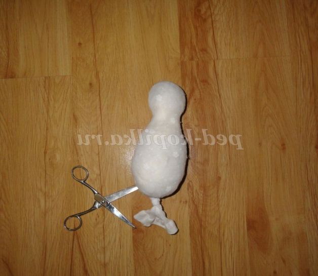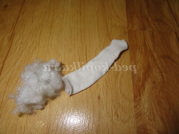 1. Взяти білий гольф і наповнити його синтепоном, не дуже щільно. Повинна вийти довга фігура, знизу зав'язати на узел.Резинку зрізати і розрізати упоперек навпіл