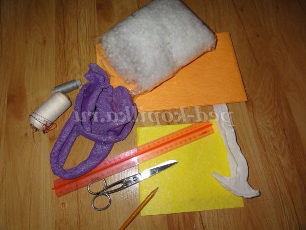 Для роботи вам знадобиться: гольф або частина від колготок білого кольору(чим менше ден, тим краще), синтепон або вата, нитки, голка, ножиці, віскозні серветки або шматочки тканини, яка не сиплеться, готові вічка або намистинки, клейовий пістолет і ... гарний настрій.
