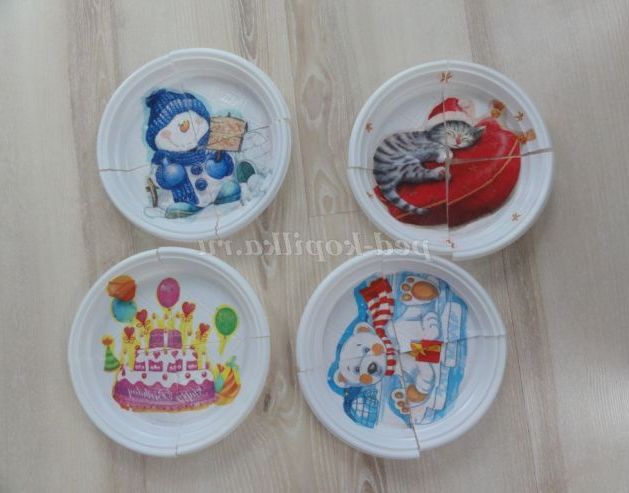 Діти розбирають фрагменти тарілок по малюнку і кольору, збирають тарілки з частин.