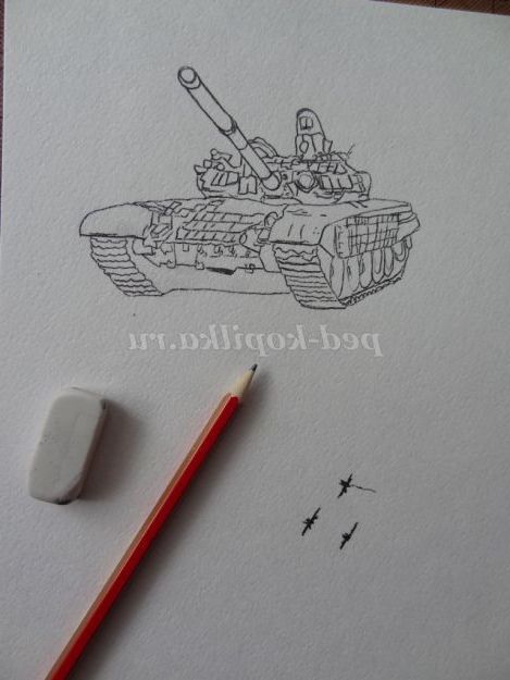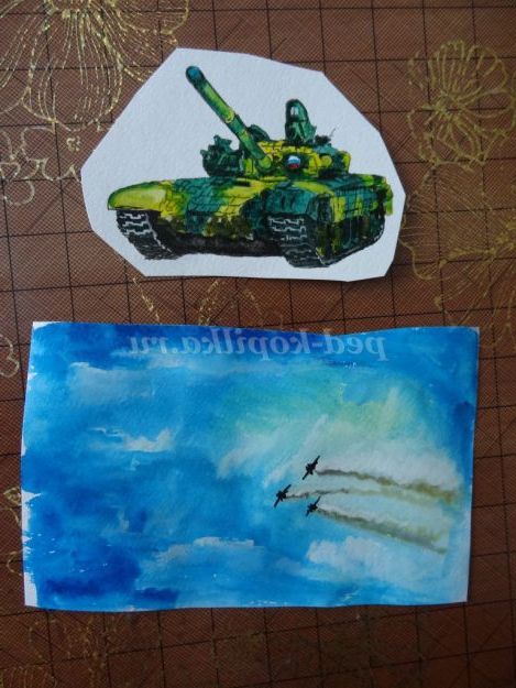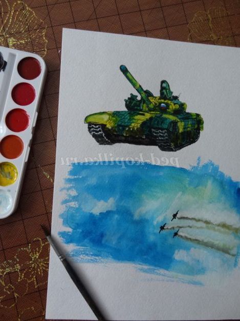 1. На акварельному папері намалювати танк і задній фон листівки (у небі летять літаки) аквареллю або гуашшю. (Малюнок 2) (Малюнок 3)