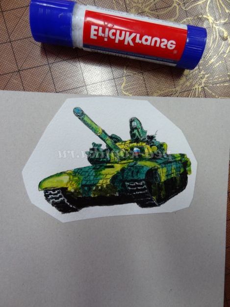 2. Наклеїти малюнок танка на картон і виріжте по контуру. (Малюнок 4) (Малюнок 5)
