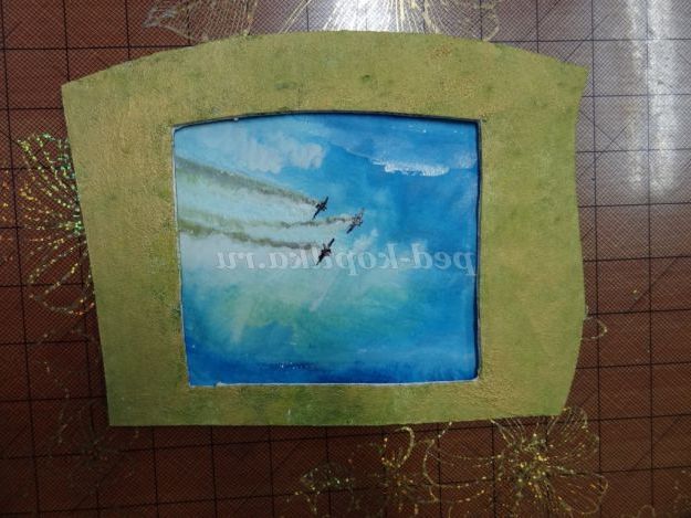 6. Із зворотного боку рамку промазати клеєм «Момент» і приклеїти фон з літаками. (Малюнок 11) (Малюнок 12)