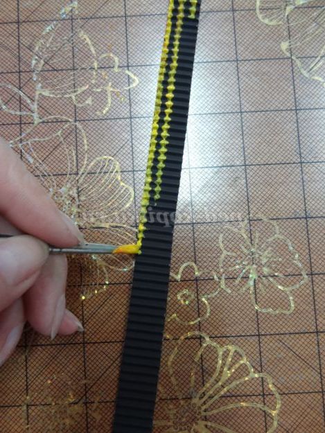 13. Виготовляємо Георгіївську стрічку. На смужці гофрованого картону промальовуємо смужки жовтого гуашшю. (Малюнок 21) (Малюнок 22)