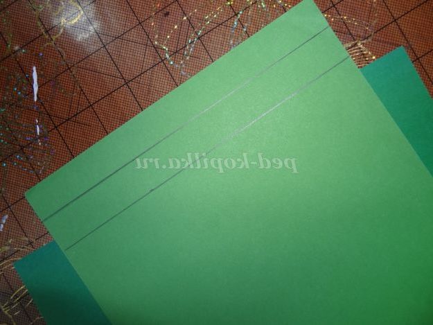 9. На аркуші зеленого паперу прочерчиваем лінії (ширина 2 см), нарізаємо смужки. (Малюнок 15)