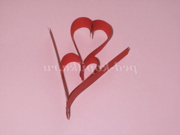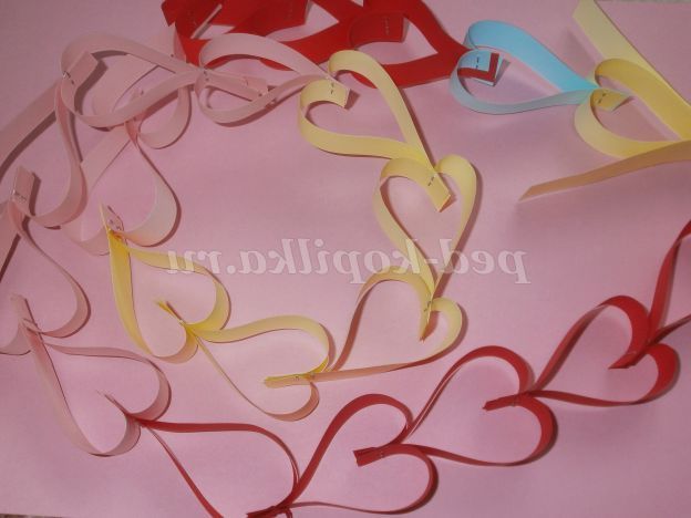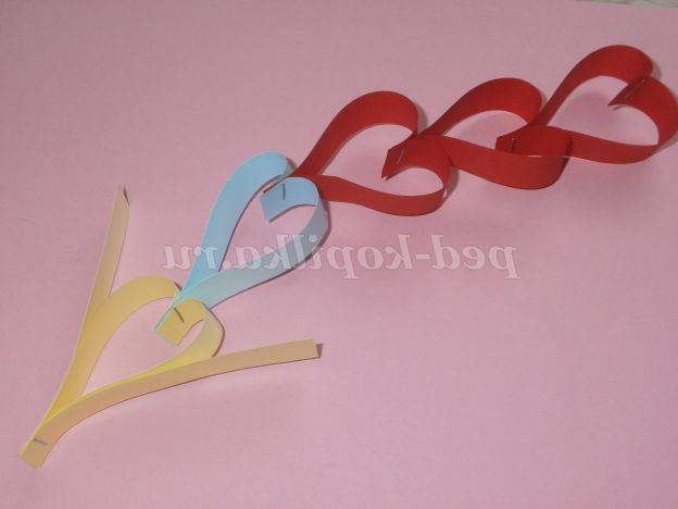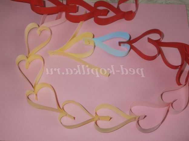 4. Кінці смужок знову вивертаємо, прикладаємо дві смужки і скріплюємо. Так повторюємо стільки разів, якої довжини буде ваша гірлянда. Використовуємо смужки різного кольору, тоді гірлянда буде яскравою, різнобарвною