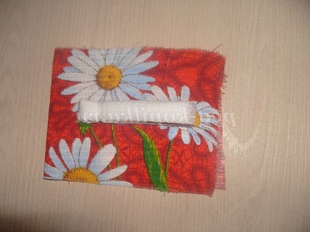 • З клаптя іншого кольору, також робимо скручування, з обох сторін відступивши близько 1 см стягаємо скручування - це будуть ручки ляльки (фото3)