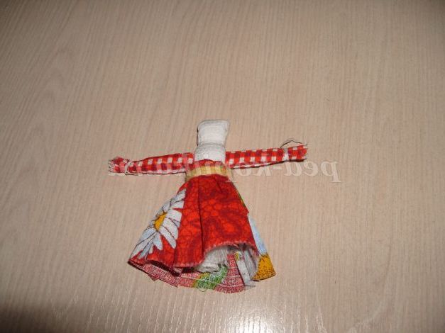 • Для формування спідниці нам необхідний клапоть кольорової тканини, складаємо його навпіл і збираємо спідничку. Обертаємо спідницю навколо талії ляльки і фіксуємо її ниткою на 2-3 вузлика. Розправляємо складочки на спідниці. (фото5)