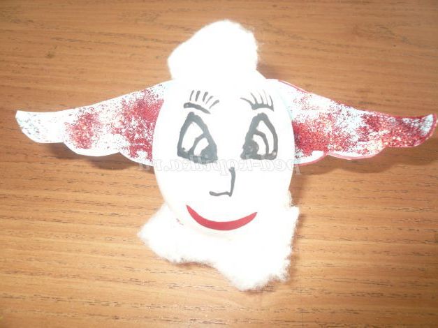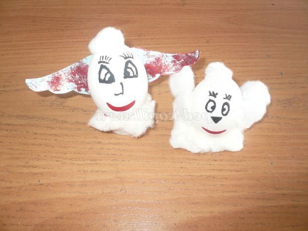 Можна прикрасити яйця ватою і намалювати цікаві особи, а якщо приклеїти ще й крильця, то вийдуть милі янголята до великодня.