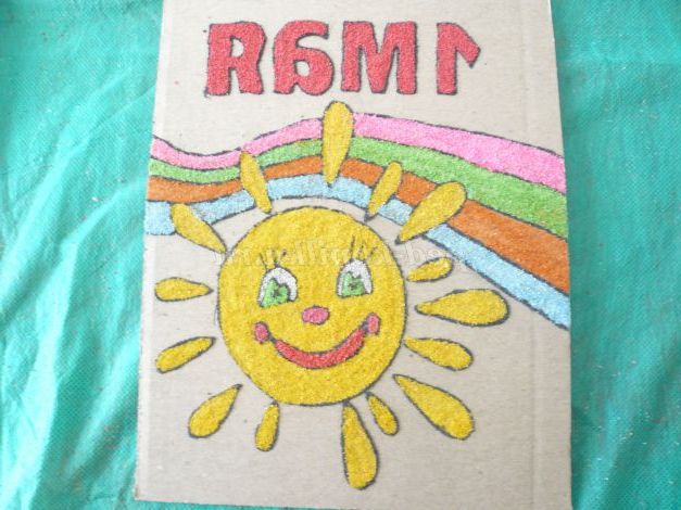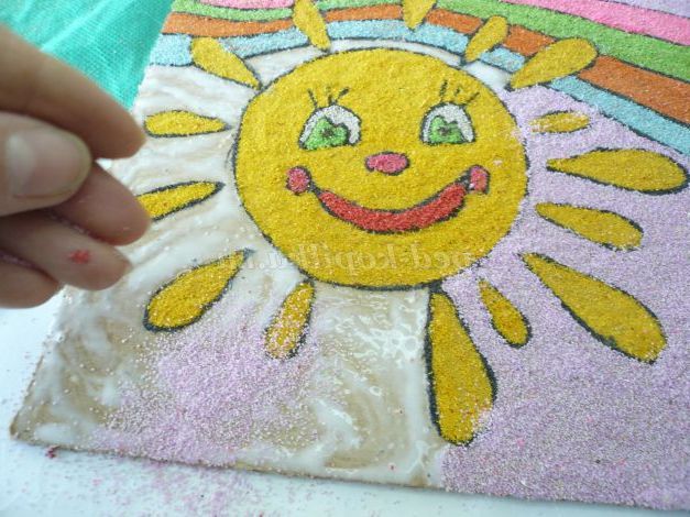 Розфарбовуємо веселку, для цього нам знадобляться, тирсу чотирьох кольорів. Акуратно, пензлем, по черзі наносимо клей і за секторами, засипаємо тирсою. У кожного сектора - свій колір: рожевий, зелений, помаранчевий, блакитний.