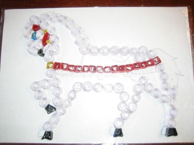 8. Порожній простір «коня» закрити білими ролами, приклеюючи їх один до одного. Приклеїти хвіст, гриву, сніг, що летить з-під копит. Дати виробі висохнути і тихенько від'єднати від файлу. Зробити три таких коня