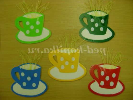 теми «Посуд», можна запропонувати дітям подути і остудити гарячий чай. Для виготовлення допомоги знадобився картон, плівки та кольоровий шпагат.