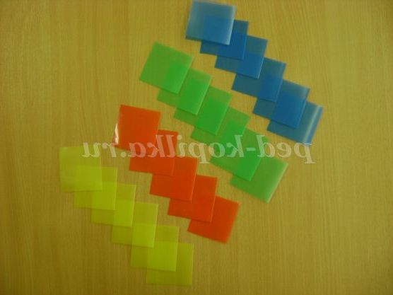 Діти дістають з кошички кольорові скельця того ж кольору, що і квадрат. Називають колір.