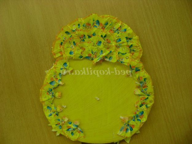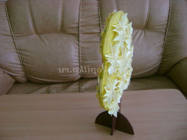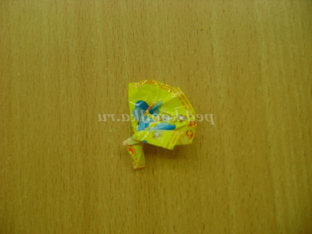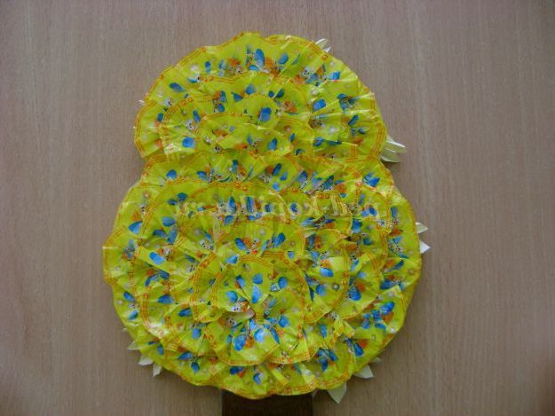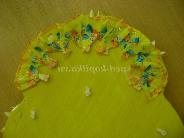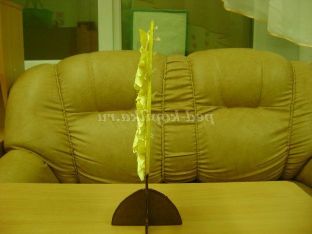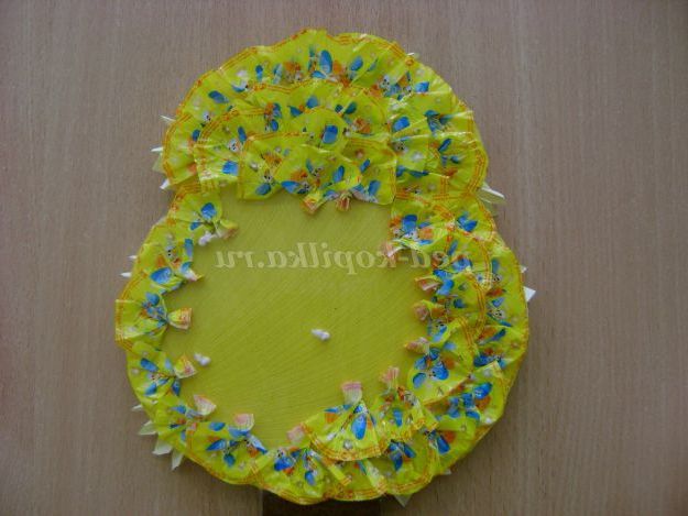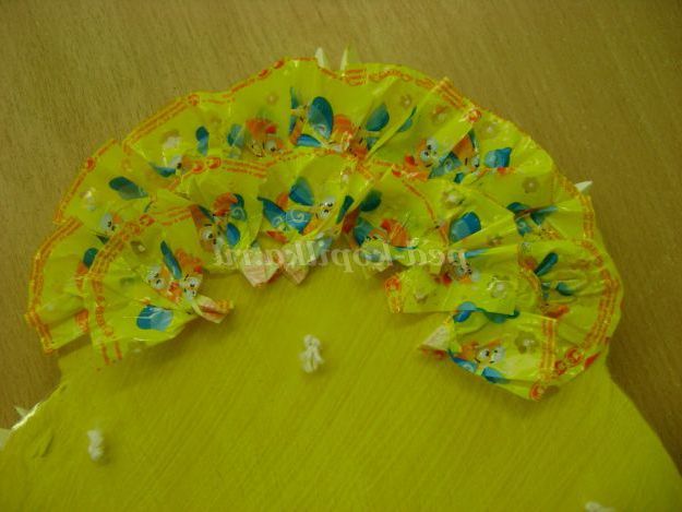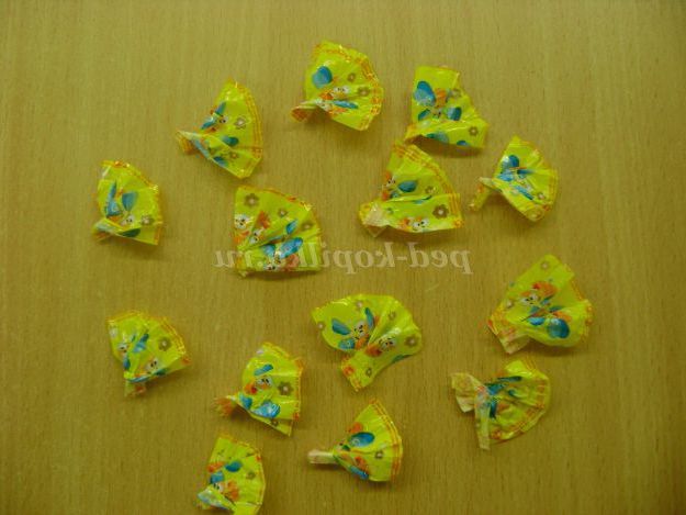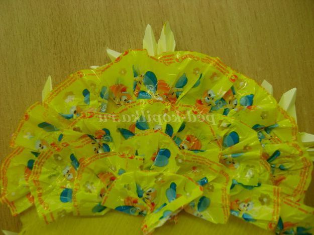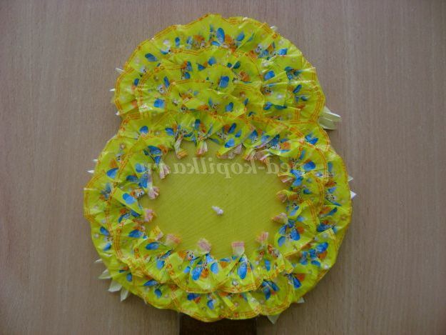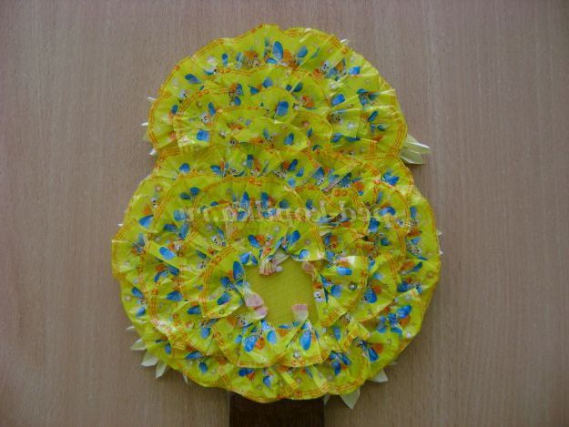 17. Зворотна сторона дерева виглядає не естетично. Треба закрити вузлики. Для цього беремо фантики від цукерок жовтого кольору. Я скористалася фантиками від цукерок «Шалена бджілка» (цукерок було 500 г).
