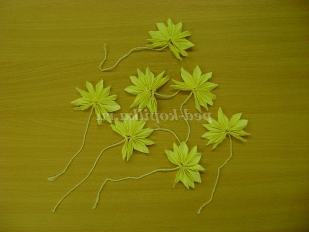9. Будемо з них робити осіннє листя для нашого дерева. Листя схожі на кленові. Для кожного потрібно 5 модулів-галочок, двосторонній скотч і ножиці.