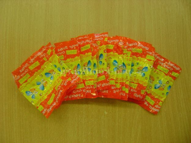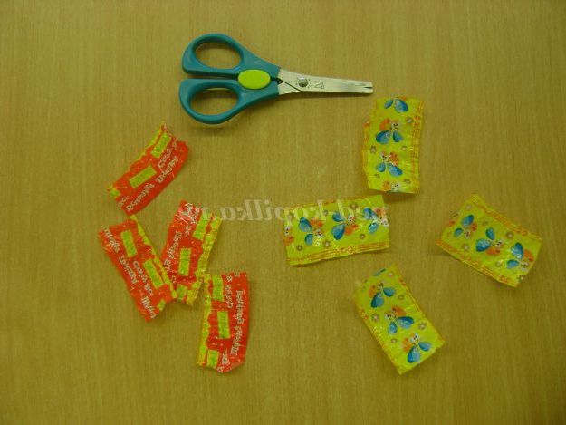 Відрізаємо у кожного фантика смужки з обох боку червоного кольору. Залишаються жовті смужки шириною приблизно 5 див.