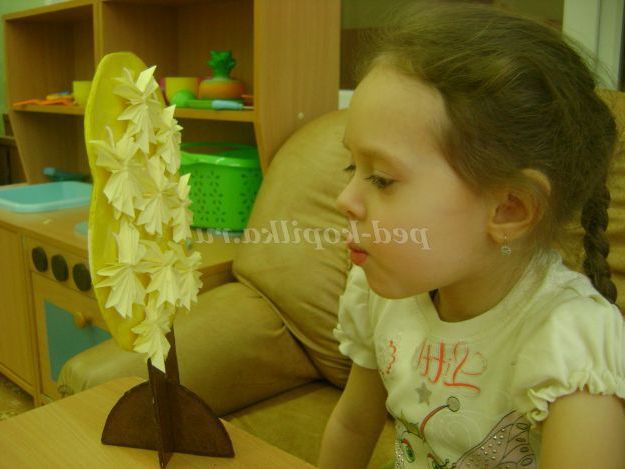 Цьому треба приділяти увагу. Для розвитку повітряної струменя було виготовлено дидактичний посібник «Осіннє дерево».Пособие зручно зберігати в коробці, поклавши його горизонтально. Нижня частина - знімна підставка. При бажанні дитина самостійно може встановити дерево на підставку і тренувати дихання в ігровій формі.