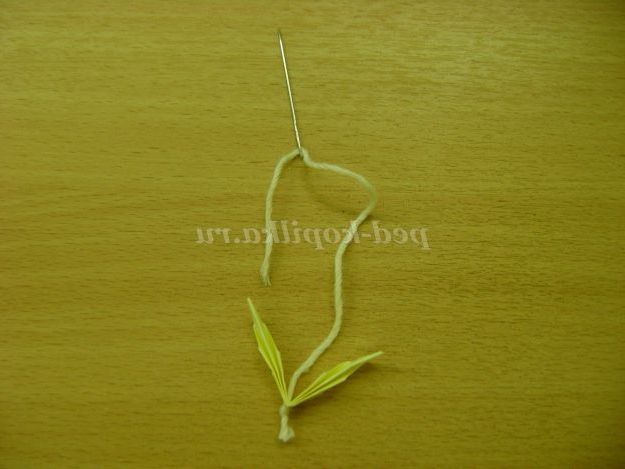 Перевертаємо на лицьову сторону, смикаємо за ниточку до упору (до вузлика), перевіряємо, як лист закріпився. Він повинен вільно розгойдуватися на нитці.