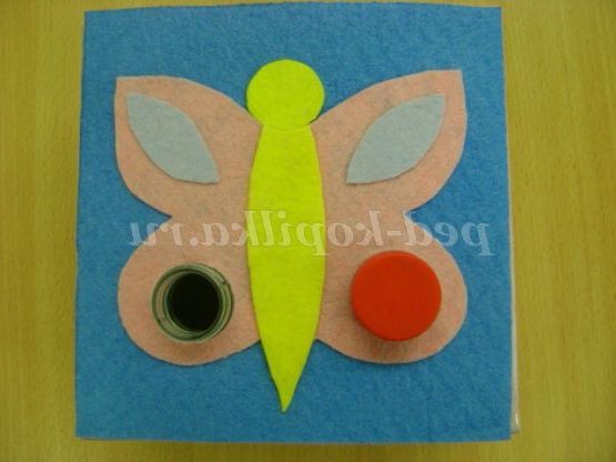 Хід гри: вихователь пропонує дитині розглянути готову картинку, наприклад, «Кораблик», «Метелик», «Ягоди вишні» і пропонує підібрати пробку за зразком. Дитина виконує завдання і називає використовуваний колір пробки.