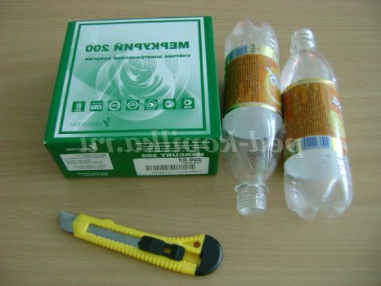 1. Взяти коробку квадратної форми, 2-е пластикові пляшки і канцелярський ніж.