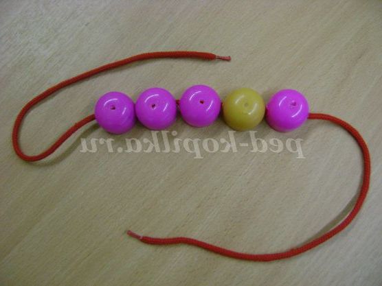 Хід гри: вихователь пропонує дитині уважно розглянути намистинки на шнурку і визначити, яка бусинка не така, як всі (відрізняється за кольором). Потім просить виправити помилку.