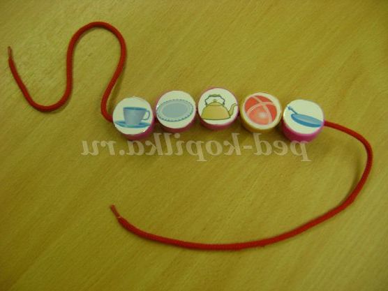 Хід гри: вихователь просить дитину одягти на шнурок, наприклад, намистинки червоного кольору.