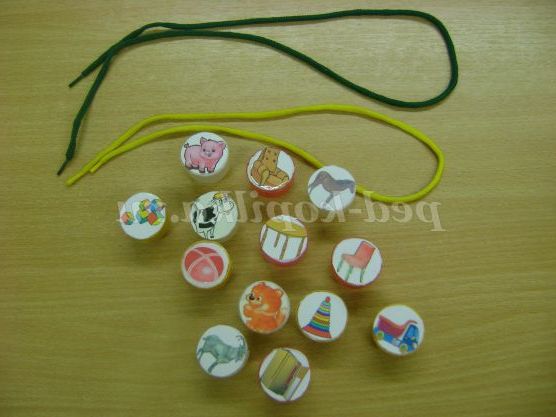 Хід гри: (лексична тема вибирається за бажанням, наприклад, гра за темою «Свійські тварини»). Вихователь пропонує дитині відгадати загадку, вибрати бусинку з відгадкою і надягти на шнурок.