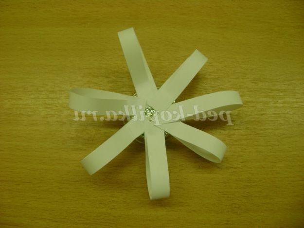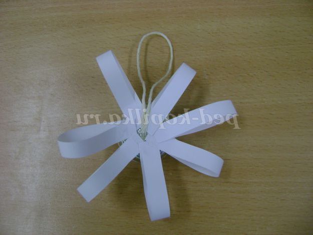 4. Ми візьмемо для сніжинки 6 «петельок». На перевернуту клітинку заповненої з серединкою з допомогою клею " момент " наклеїти «петельки». Виконує педагог, так як клей токсичный.Можно довірити виконати це завдання дитині, якщо замінити використання клею на двосторонній скотч.