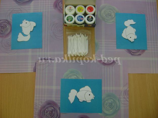 Засоби: ватні палички, гуаш, пластилін, фломастери, клей ПВА, пензлик, гуртки з кольорового паперу, заготівлі рибок, аудіозапис з музикою, магнітофон.