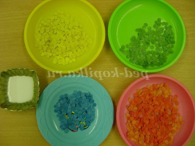 -Правильно. Поступово намазуючи частини малюнка, будемо докладати кольорові гуртки.
