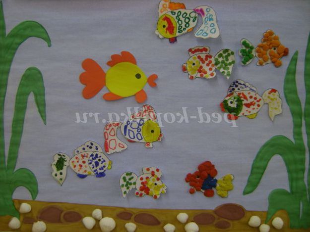 -Подивіться, як по-різному вони виглядають. Покажіть, де рибки, розфарбовані за допомогою гуаші і ватних паличок, а де з допомогою пластиліну?