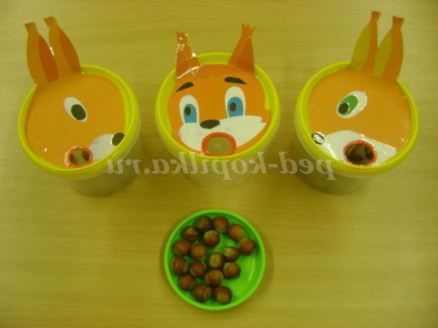 /на столі відерця з зображенням більчат, горіхи фундук. Діти беруть горіхи за одним і кладуть у рот бельчатам/