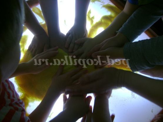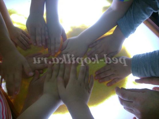 /діти згрібають манку ребром долонь в купу, надаючи круглу форму