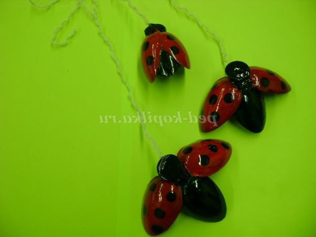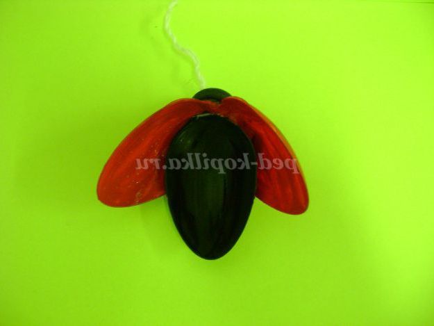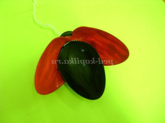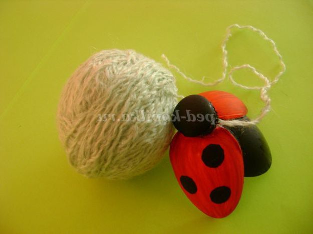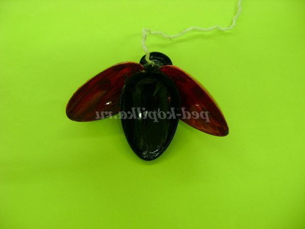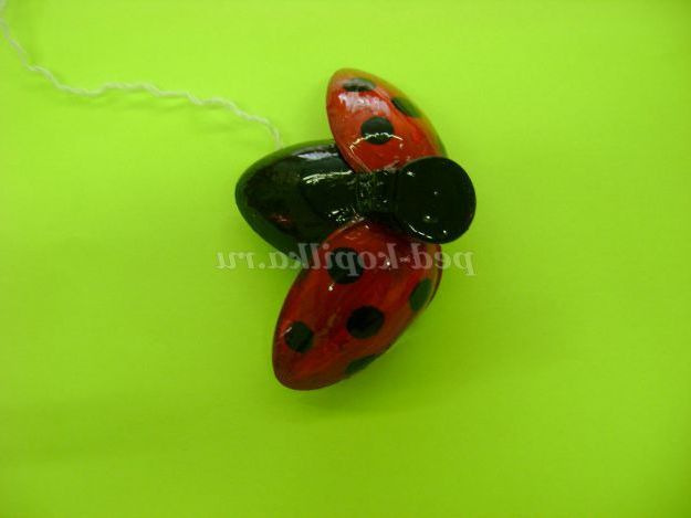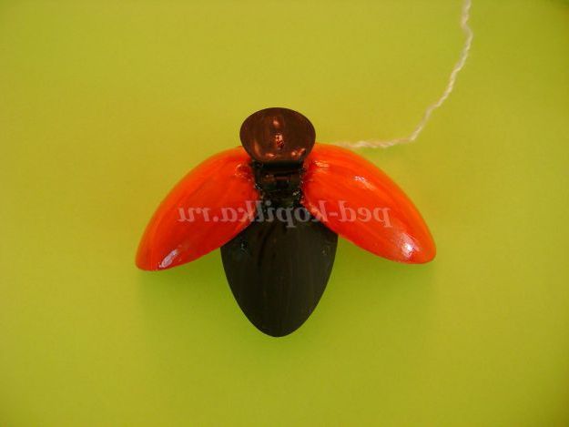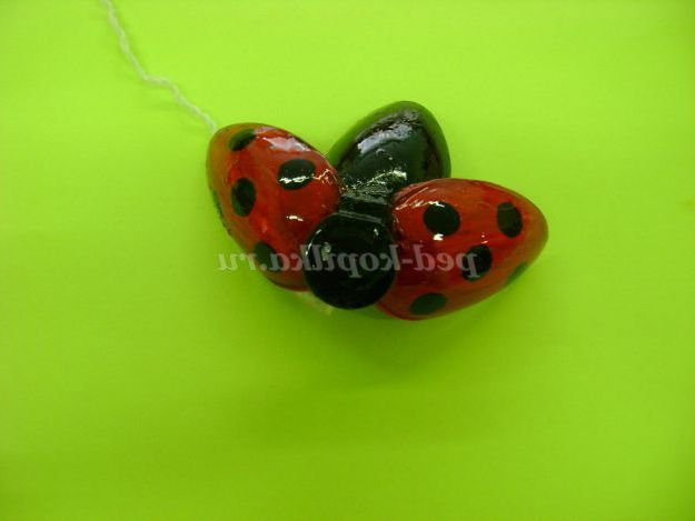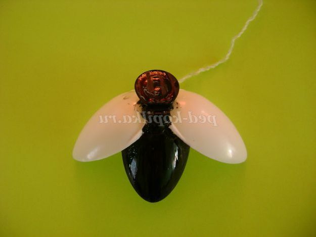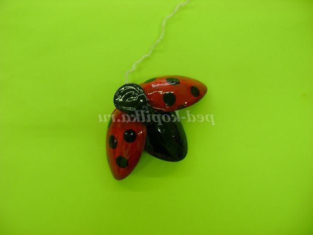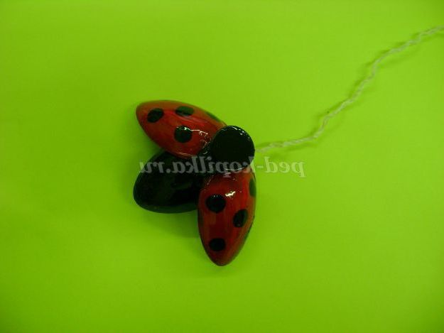 Декоративний камінчик виявився важким. Він переважує тулуб, коли божу корівку подвешиваем.Чтобы вийти з положення, нитка довелося завести по лінії з'єднання голови з тулубом назад, за голову(це місце промазування клеєм) і приклеить.Нить тепер за головою, ближче до крил. Можна закріпити нитку клеєм Момент або за допомогою клею-пістолета.