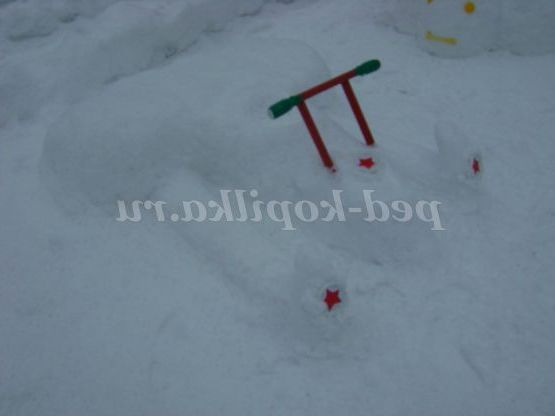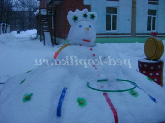 Організовуючи прогулянки взимку, ми також намагаємося створювати умови для активної рухової діяльності дітей. Прекрасним будівельним матеріалом служить сніг, з якого ми робимо снігові споруди не тільки для веселих ігор дітей, але і з метою виконання фізичних вправ на свіжому повітрі. Вони стають відмінним сніговим фізкультурним обладнанням до приходу весни. Споруди намагаємося робити багатофункціональними, яскравими. Прикрашаємо викидними матеріалом і шматочками тканини.