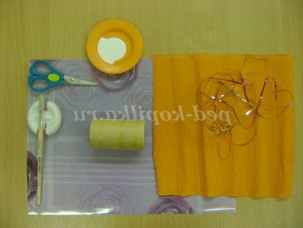 на столі лежать гофрований папір, клей ПВА, пензлик, ялинковий дощ/