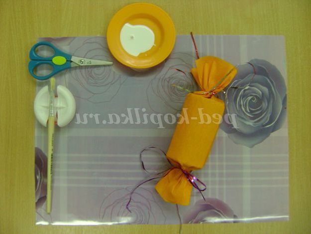 Відмінний зразок. Давайте розглянемо цукерку. Рулончик загорнуто в обгортку, яким послужить гофрований папір, кінці загорнуті і зав'язані з допомогою дощику. Не забудьте зробити петлю, щоб цукерку повісити на ялинку