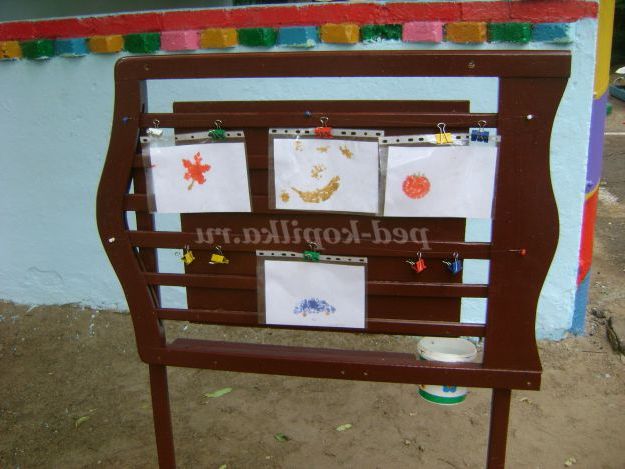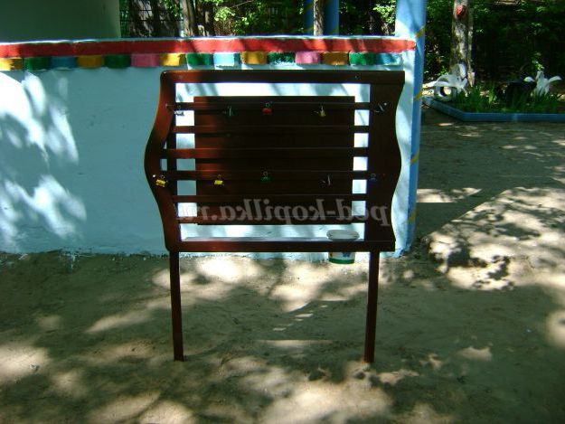 Використана спинка від дитячого ліжка, дерев'яні бруски, дріт, канцелярські цвяхи та затискачі. Із зворотного боку прикріплено фанера для малювання крейдою. На ніжці закріплено відро для води. Там є і ганчірочка, яку діти можуть використовувати для стирання зображення.