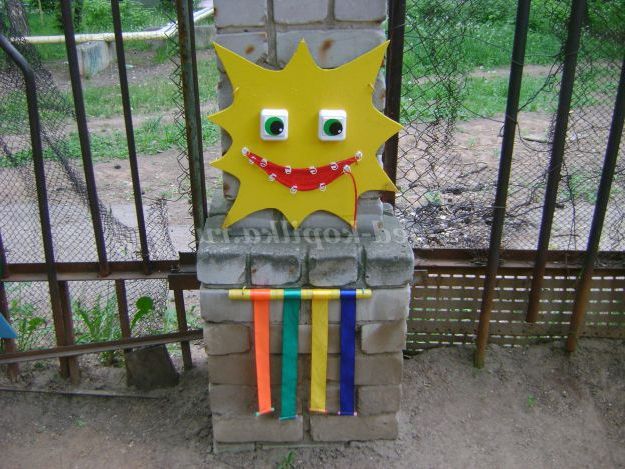 сонечко. Воно зроблене з фанери. Очима служать вимикачі. Їх можна закривати і відкривати. Рот-це шнурівка. Також використані колечка від коробок з соком.