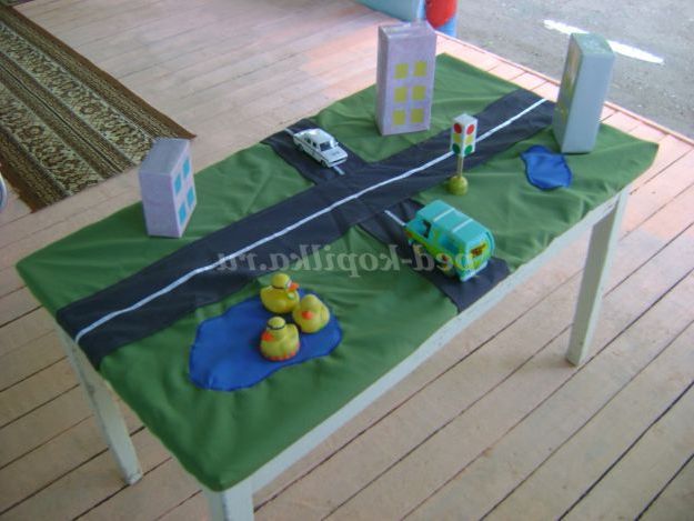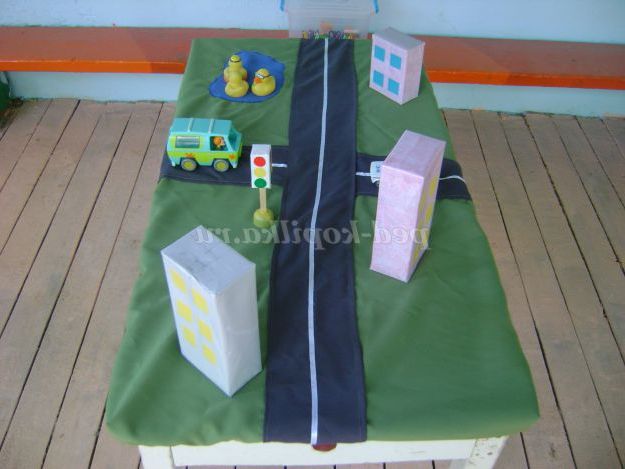 Дорога виконана у вигляді накидки, вона пошита з тканини. Використана гумка, яка вставлена по краях дороги. Вона дозволяє вільно одягати дорогу на стіл. Будинки, світлофор зроблені з непридатного матеріалу - картонних коробок. Машини та атрибути для гри зберігаються в пластиковому контейнері.
