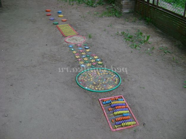 Використовували зруби гілок дерев невеликого діаметра, денця пластикових пляшок, реечки від спинки дитячого ліжечка, старі порахунки, капсули від кіндер-сюрпризів. Босохожденіе в літній період дозволить загартувати дитячий організм.