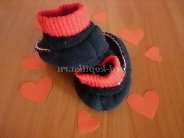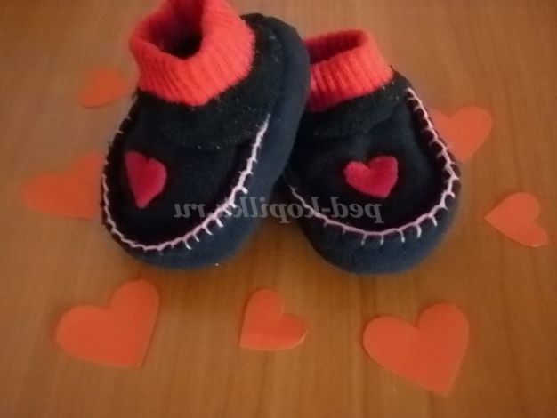 13. Готові шкарпетки - пінетки вивертаємо і декоруємо сердечками з червоного фетру. Ось такі шкарпетки - пінетки вийшли на радість вам і вашому малюкові!