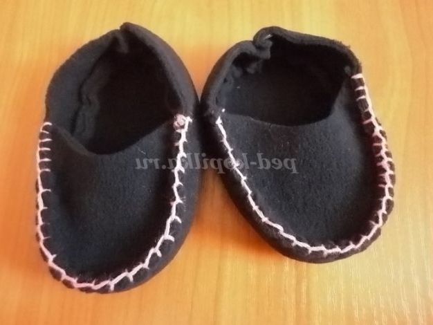10. Далі беремо голку з рожевою ниткою і приступаємо до з'єднання верхньої частини до підошви обметочным швом! Вийшли такі тапочки!